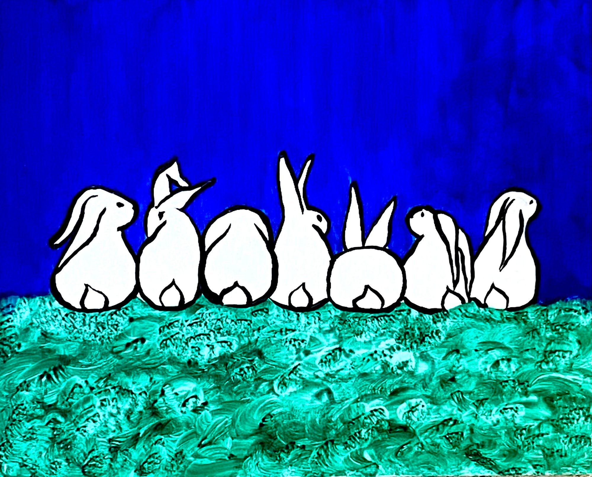 Mixed media on panel, hand-painted bunnies, glossy finish